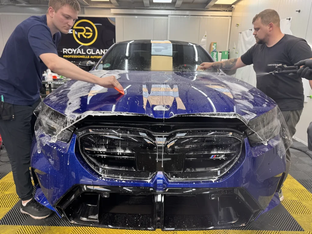 Vor kurzem durften wir in unserer Werkstatt ein echtes Highlight bekleben: den brandneuen BMW M5 Limousine mit Performance-Paket. Dieses Fahrzeug steht nicht nur für pure Power und Dynamik, sondern auch für ein äußerst komplexes Karosseriedesign mit vielen Details, scharfen Kanten und markanten Bauteilen. Genau das macht die professionelle Verklebung von Lackschutzfolie so anspruchsvoll – und spannend.